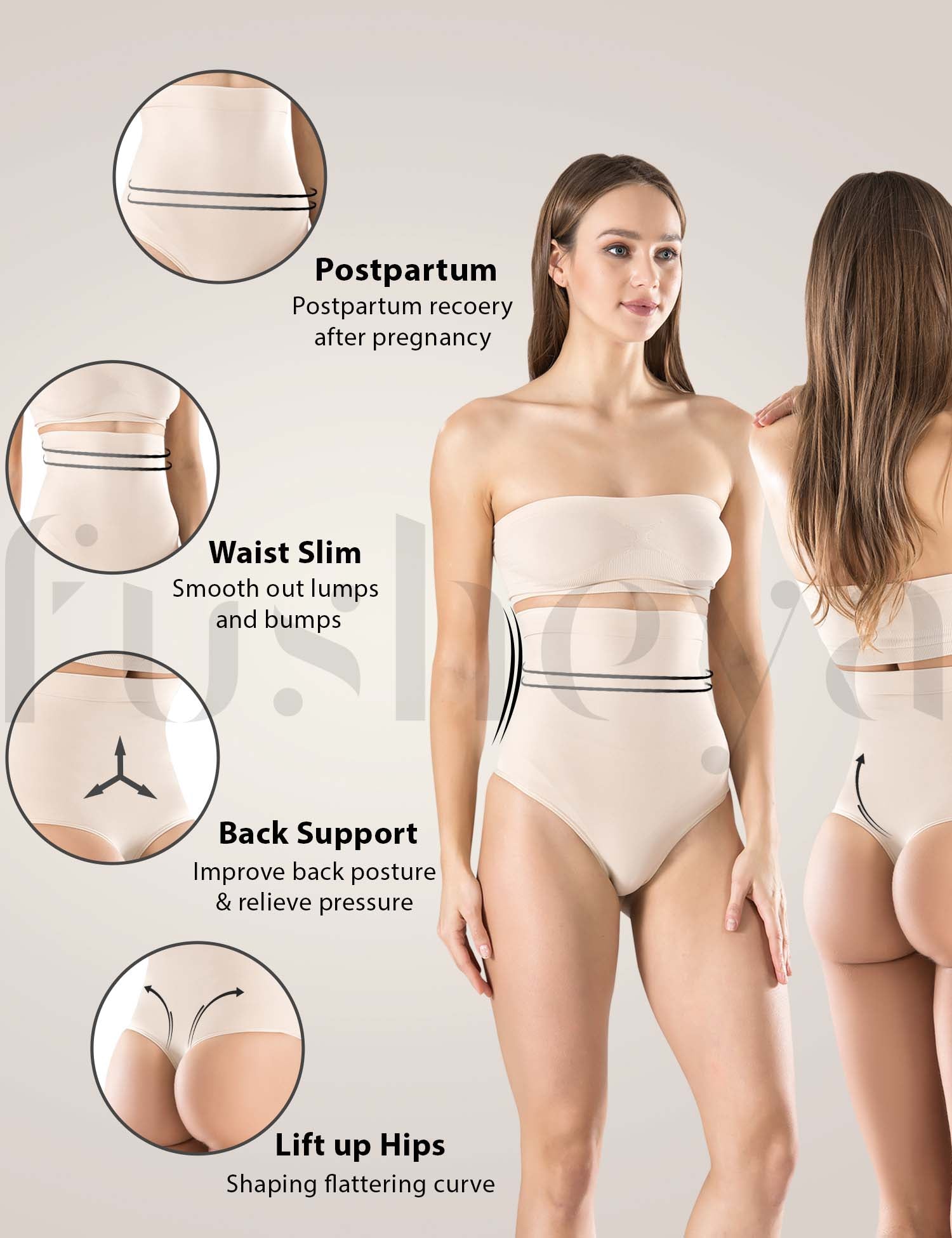 - MIDSECTION AND BACK SUPPORT: Fusheya’s thong body shaper is designed with a two-layer midsection to flatten your tummy with higher compression, effectively tightens your abdomen, helps to reduce back pain caused by poor posture, provides support for your midsection and back and improving your posture overall.